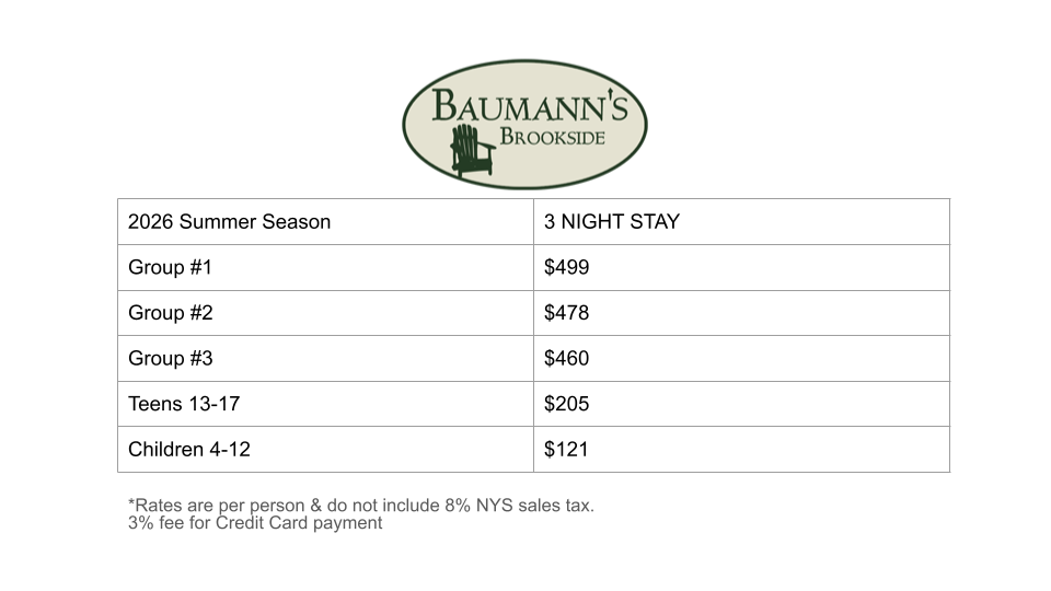 Our family looks forward to welcoming you to Baumann’s Brookside summer resort, the perfect location for your special vacation or family reunion, located in the beautiful mountains of the Northern Catskills. We are thrilled to be celebrating 105 years in business, 5th generation hosts serving 5th generation guests. Our family is onsite daily to meet all your vacation needs.
